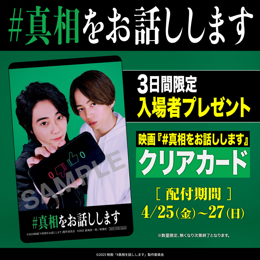 本編に登場し、物語の軸にもなる生配信暴露チャンネル「#真相をお話しします」。岡山天音演じるチャンネル管理人が、“同時視聴者数150万人を突破したらこのチャンネルの「#真相」を暴露する”という本編同様に、映画の観客動員数150万人の突破を記念し、これまで明かされてこなかった本作の「#真相」を大暴露!